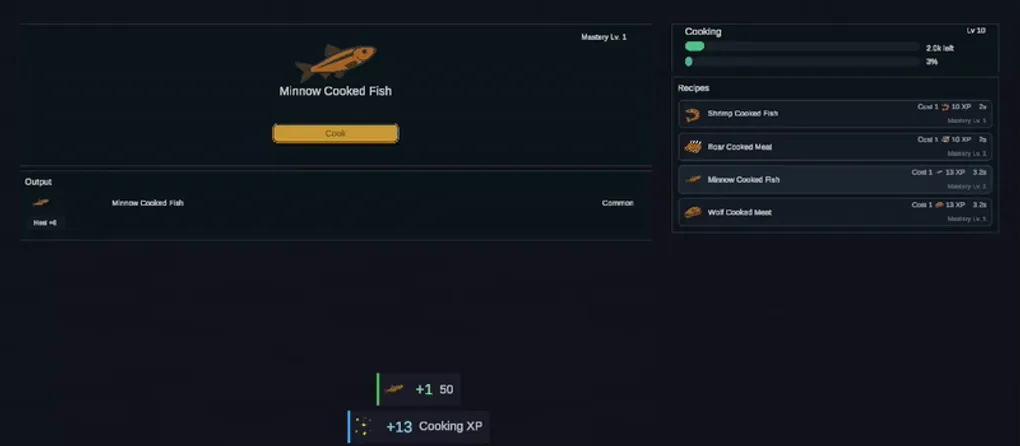 Cooked food restores health and scales with progression. Cooking rewards preparation and long-term planning.